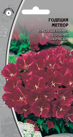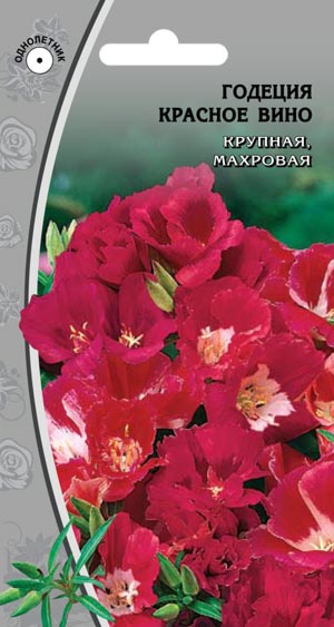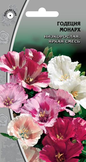 Смесь однолетней махровой годеции. Куст компактный, высотой 60 см. Цветки колокольчатые, махровые, атласные, диаметром 8 см, собраны в кистевидные соцветия, которые вытягивается по мере распускания новых бутонов. Цветет обильно и продолжительно с июня до глубокой осени. Годеция неприхотлива, холодостойка. Используется для украшения балконов, в рабатках, клумбах, групповых посадках, подходит для уличных вазонов и срезки. Посев производят в апреле-мае прямо в грунт или в марте-апреле, в условиях теплицы или парника, посевы прореживают, выдерживая расстояние между растениями 15-20 см. Чтобы поддерживать обильное и продолжительное цветение, обязательно отщипывают завязи. Годеция предпочитает расти на солнечных участках с суглинистыми, окультуренными почвами, не выносит переувлажнения.