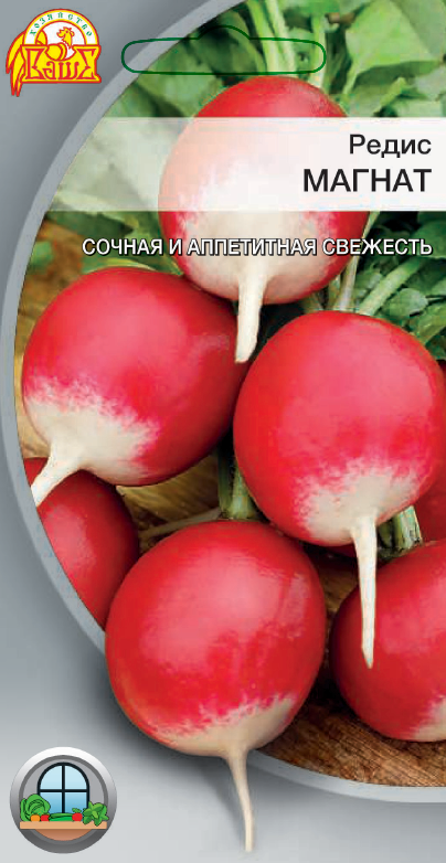 Незаменимый в свежих салатах среднеспелый сорт. Корнеплоды округлые, розово-красные с белым кончиком, массой 18-25г. Мякоть белая, нежная, сочная, хрустящая, слабо-острая и очень вкусная. Используют в свежем виде просто «похрустеть», а также для приготовления окрошек, салатов, летних супов. Ценность сорта: дружное формирование урожая, выравненность корнеплодов по форме и размеру, отсутствие пустот в корнеплодах, устойчивость к растрескиванию и цветушности. Долго сохраняет товарные качества.