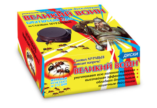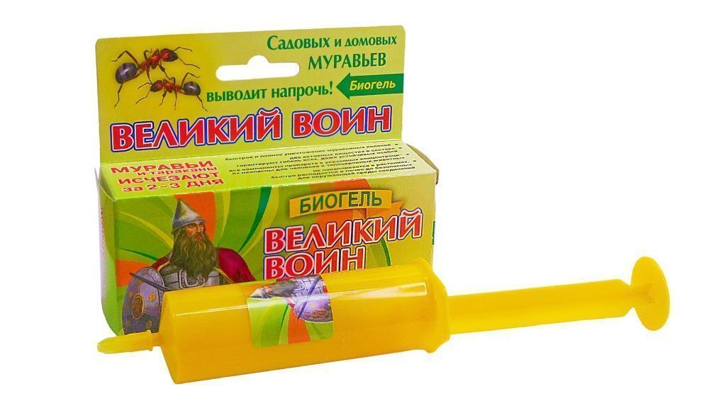 Ситуация кардинально меняется благодаря новому средству «Великий Воин — гель против садовых муравьев». Этот гель — приманка с двумя веществами, губительными для муравьев. Специальный состав ее так привлекателен для насекомых, что рабочие особи не только охотно поедают ее сами, но приносят в муравейник и кормят личинок. Благодаря этому уже через несколько дней погибает вся муравьиная колония.