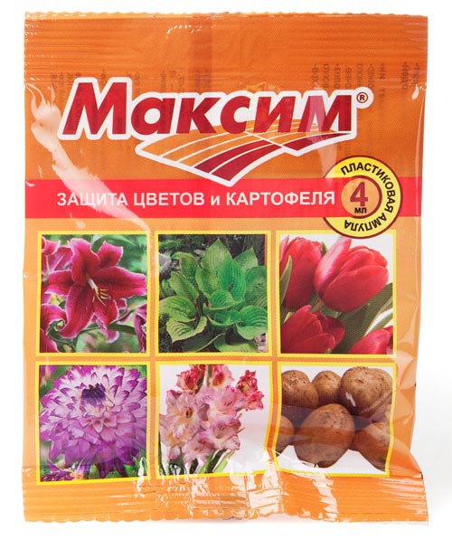 «Максим» — Препарат защитно-контактного действия для защиты от болезней луковичных (тюльпаны, гладиолусы, лилии и т.д.), георгинов, пионов, корней и корневищ других цветов, а также семенного картофеля. Создает защитный барьер на поверхности посадочного материала и в прикорневой зоне в почве. Эффективен против всех видов гнилей, плесеней, фузариоза, ризоктониоза, парши и других заболеваний. Защищает растения от болезней в течение всего периода роста и хранения.