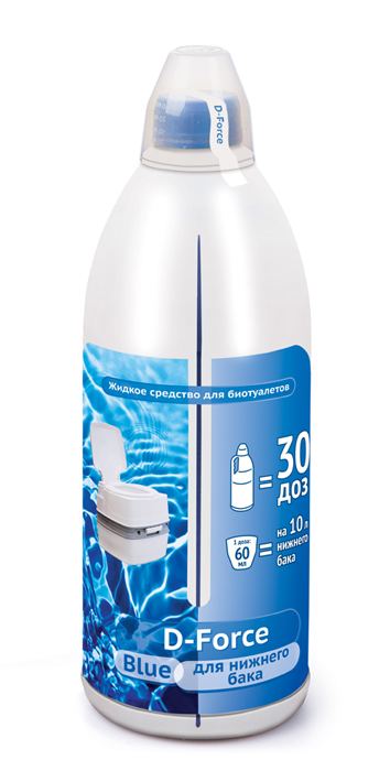 Состоит из биологически разлагаемых компонентов, что делает средство безопасным как для человека, так и для окружающей среды. Концентрат заливается с небольшим количеством воды в накопительный бак биотуалета. Предотвращает газообразование, развитие гнилостных процессов, нейтрализует неприятные запахи, обладает дезодорирующим эффектом. Благодаря эффективному растворению твердых отходов, внутренние стенки бака остаются чистыми. При использовании экологически чистой жидкости D-Force Blue для нижнего бака совместно с биотуалетом образующиеся отходы можно выливать на землю без опасности нанести вред себе или окружающей среде. Преимущества: Выгодно: концентрированное средство с экономичным расходом. Не токсично. Не раздражает кожу. Нейтрализует неприятные запахи. Обладает мощным дезодорирующим эффектом. Не вызывает коррозии и старения пластмасс, металлов, резины, очищает внутренние стенки бака. Разлагает твердые отходы и бумагу. Предотвращает газообразование. Препятствует размножению бактерий. Экологически чистое с